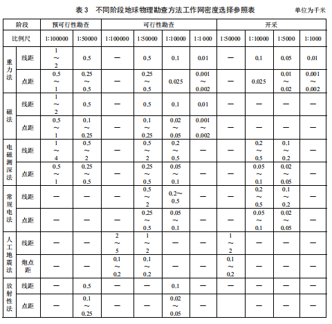 h) 地球物理方法實(shí)物工作量應(yīng)滿足相應(yīng)比例尺(參見(jiàn)表 3)及探測(cè)深度要求;后續(xù)涉及鉆探工作的應(yīng)有異常驗(yàn)證和再解釋的設(shè)計(jì)內(nèi)容。