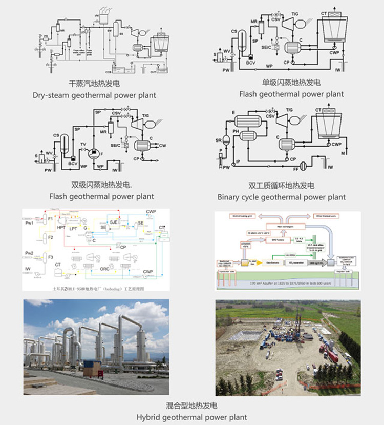 地熱發電需根據地熱流體的溫度、壓力以及它們的水、汽品質的不同而采取不同的設計方案。其主要類型包括:干蒸汽地熱發電、單級閃蒸地熱發電、雙級閃蒸地熱發電、一井一站地熱發電、混合型地熱發電、雙工質循環地熱發電、干熱巖發電。